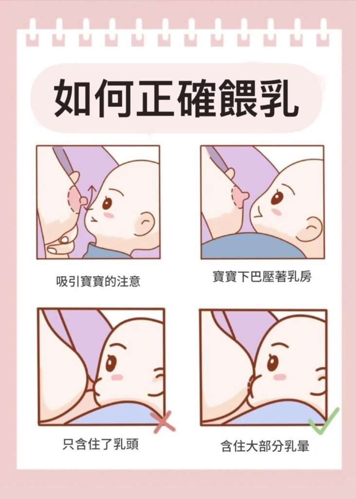 | 母乳餵養 | 寶寶的嘴巴需要含住乳頭以及大部分的乳暈 |