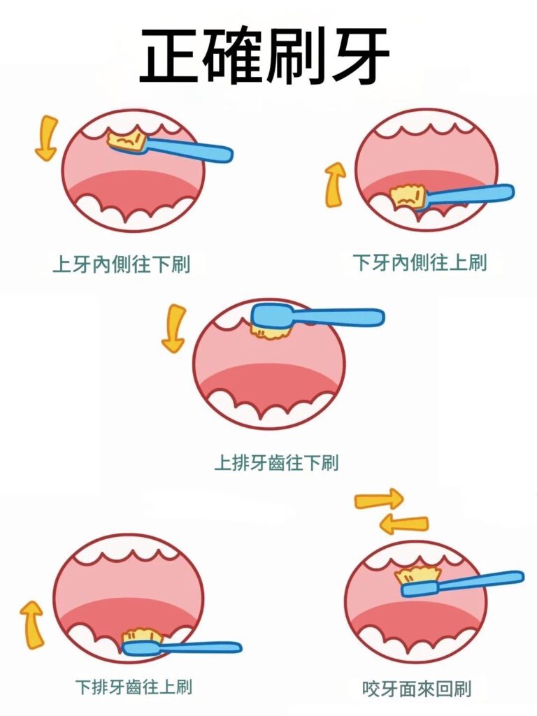 - 刷牙手法:輕柔地刷洗每個牙齒的表面,包括牙齒的咬合面、內側面和外側面。